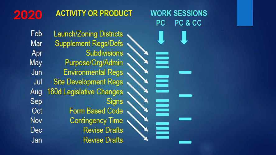 Council agenda briefings will continue to be used as a place to release the proposed changes to City Council. Starting in the spring, work sessions will begin taking place, the majority of which will be held by the Planning Commission, but there will be joint meetings between City Council and the Planning Commission along the way.