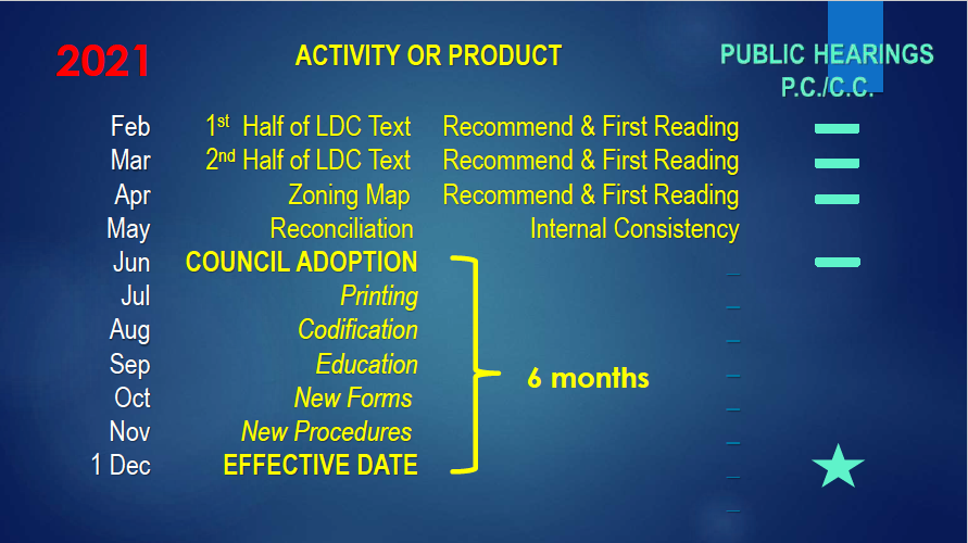 Starting this month and heading all the way into 2021, City Council, the Planning Commission, and the public will be provided with updates on the LDC and given a chance to workshop the new ideas. The adoption of the new LDC is still some time off, with Harbeck planning on a June 2021 adoption and an effective date of December 2021.