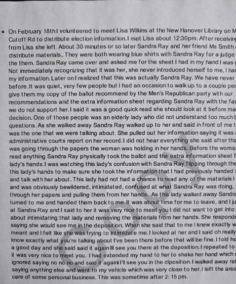 According to Korn’s complaint, he handed the pamphlet to a woman who was heading to the early voting station at the Northeast Branch of the New Hanover County Library. According to the complaint, Ray was present and approached the woman. Korn said Ray took the pamphlet from the woman and provided her own materials instead; Ray then allegedly handed Korn’s pamphlet back to him, saying she would see him ‘in the deposition,’ which he interpreted as a threat.