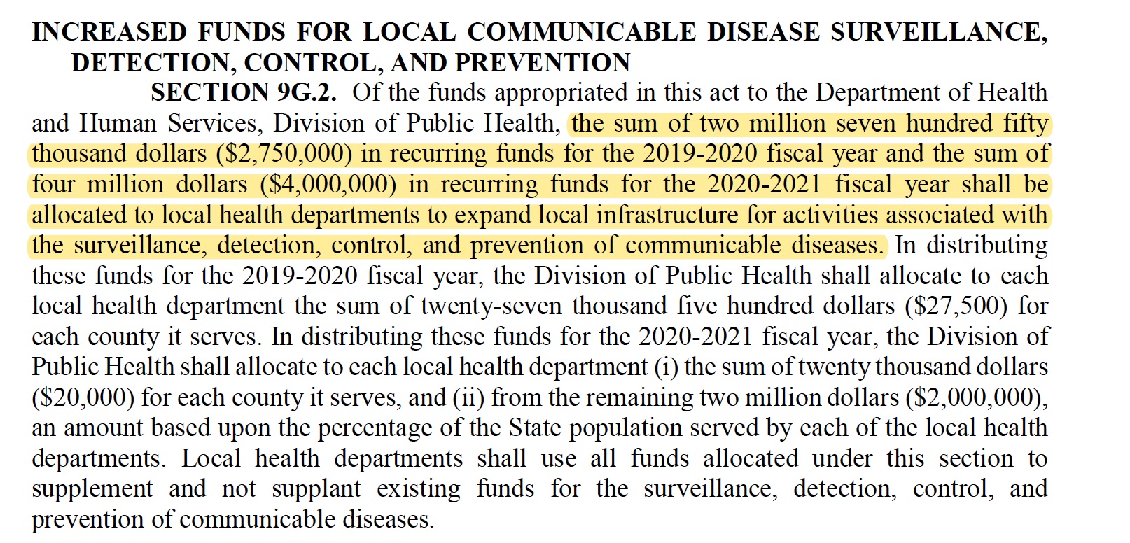 Statewide, a total of $6.75 million allocated to local county health departments included in the proposed state budget could be used to combat the “surveillance, detection, control, and prevention of communicable diseases.” Each county is eligible to receive $27,500 for the current fiscal year, $20,000 for the upcoming fiscal year, plus additional funding based on population served.