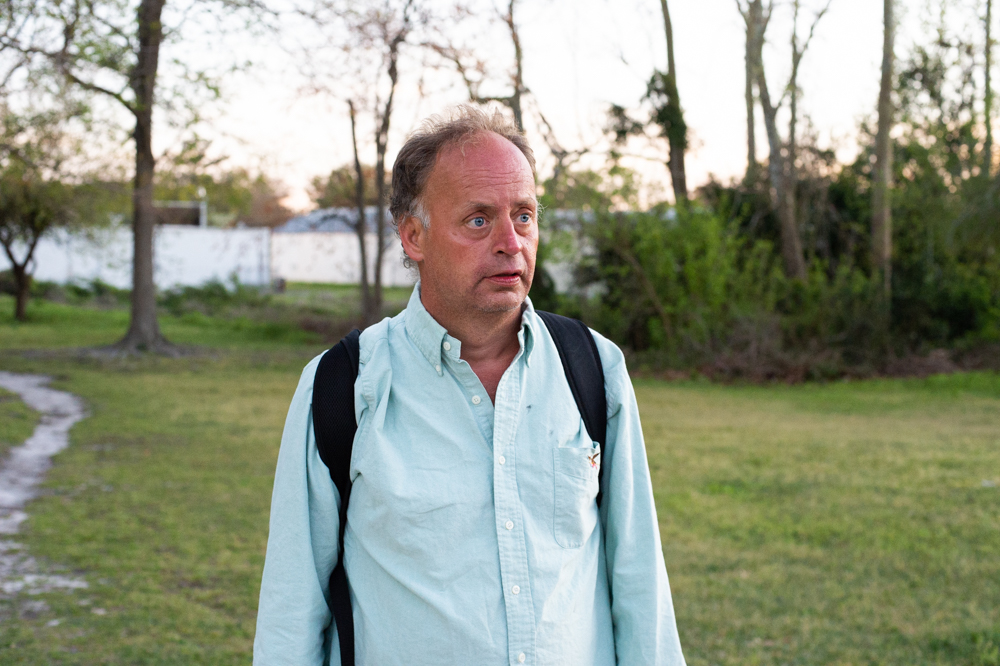Charlie Wood, 65, was walking on a path that cut through a greenbelt across from the Good Shepherd Center on Thursday evening. He has stayed at the shelter in the past but is now sleeping in the woods to the north of the building, beyond the railroad tracks, according to Wood. He said he struggles with multiple sclerosis (MS), and apologized several times for dropping his cigarette.