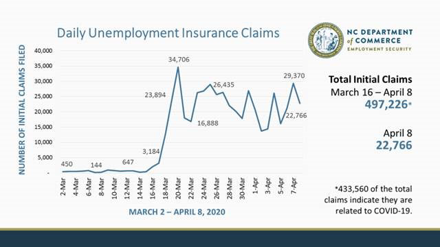 Between March 16 and April 8, nearly 500,000 North Carolinians filed unemployment insurance claims — more than 433,000 related to the economic fallout from the pandemic, including independent workers and employees laid off due to the state’s closure of bars, restaurant dining areas, and other ‘non-essential’ businesses. Those affected by the virus made up 87 percent of the total figure of claims in this period, according to the department’s Division of Employment Security (DES).