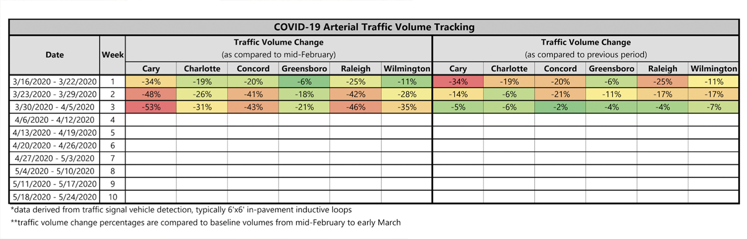 The next week, on March 26, traffic dipped another 17% from the week prior, down 28% compared to the same baseline volumes mid-February. The statewide, New Hanover County, and City stay-at-home orders went into effect March 30. Days later, on April 2, traffic volumes steeped to 35% lower than volume measured the month prior.