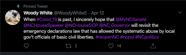 “Our county twitter feed should not be pushing out these fear mongering messages. It should instead be pointing out that only 22 people out of 230,000 in @NewHanoverCo presently have Covid and that we should be resuming our lives. #reopennc,” White said on Twitter.