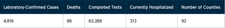 As of April 13, the state has confirmed 4,816 cases of Covid-19 in 92 counties, 86 people have died and 313 people are currently in the hospital for the virus.