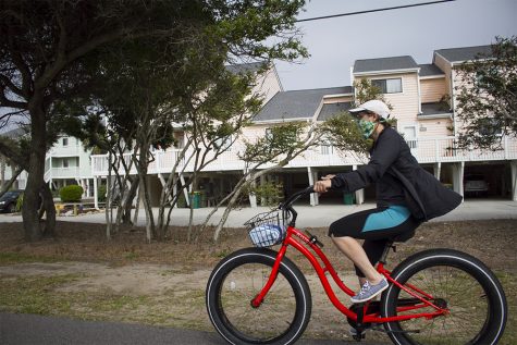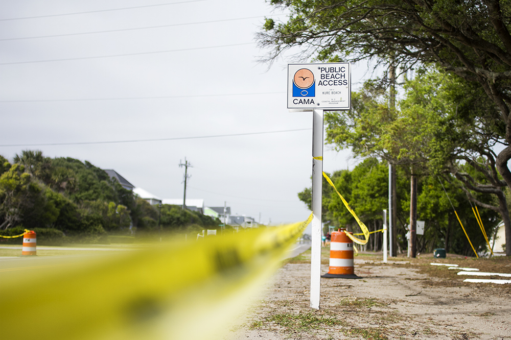 (Left) A public access sign draped in caution tape in Kure Beach. (Right) A masked woman rides past public accesses in Kure Beach.