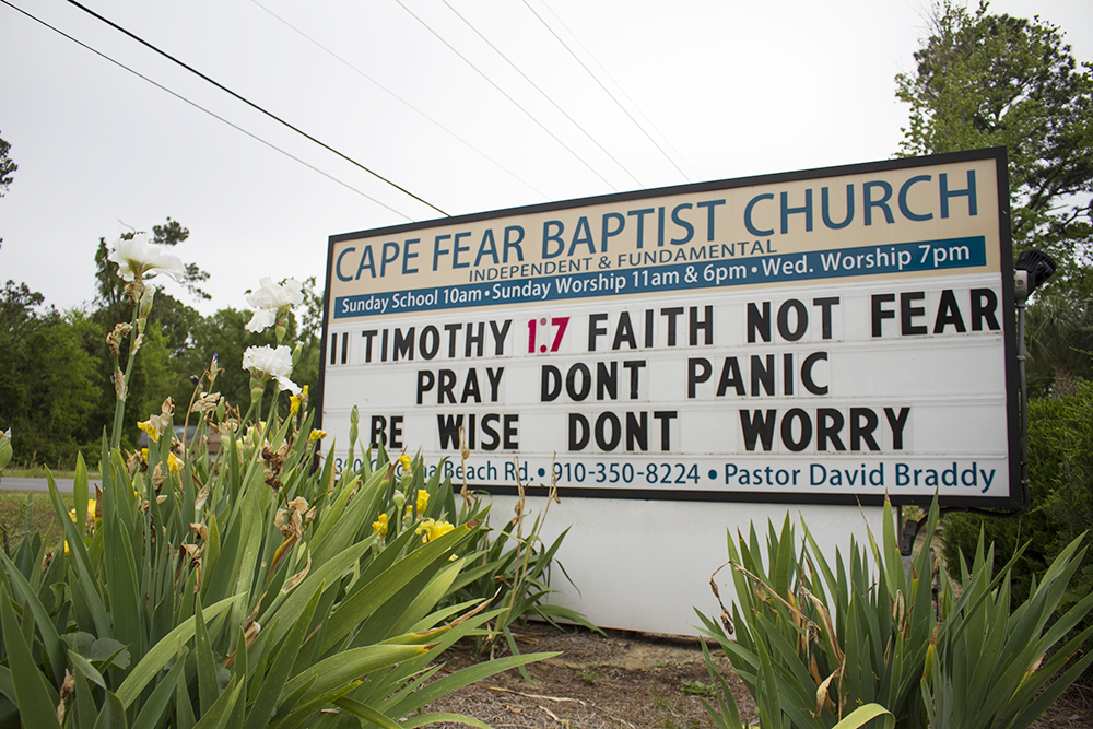 (Left) “Gratitude turns what we have into enough,” Parsley Elementary School, Wilmington. (Right) Worship with us on Facebook or Youtube Sundays at 11,” Masonboro Baptist Church, Wilmington.