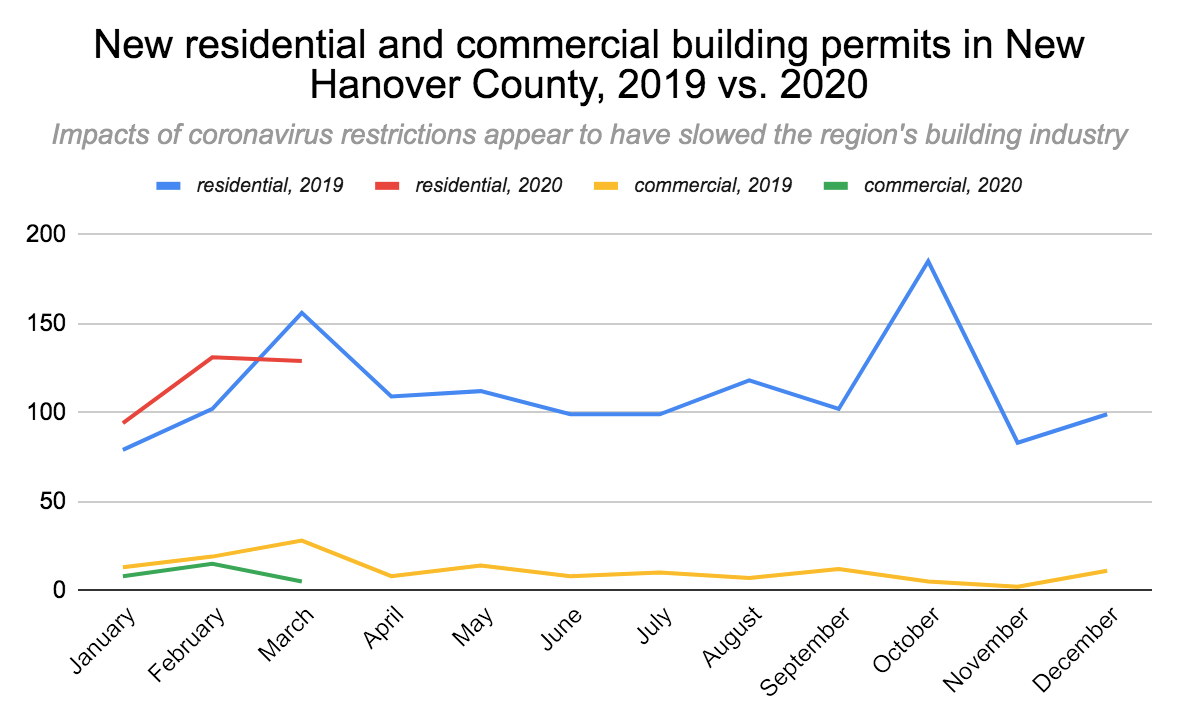 In Leland, for example, new residential building permits doubled last month compared to the same time last year. In unincorporated New Hanover County and the City of Wilmington, the number of new residential building permits was down by 27 in March, a 17% decrease compared to March 2019 and down three permits from the month prior in February.