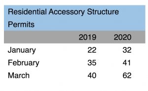 All but one category is down: accessory structure permits. A new shed, garage, pool, decks, and other structures require these accessory permits. Last month, accessory permits increased by 37% compared to February (a difference of 21 more permits). Compared to the same time last year, accessory permits more than doubled.