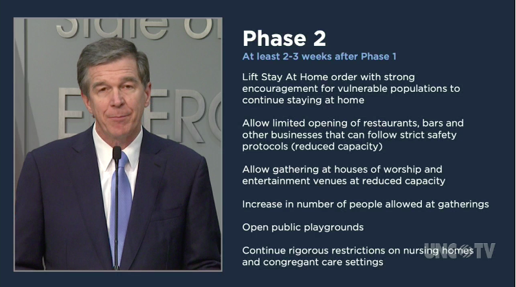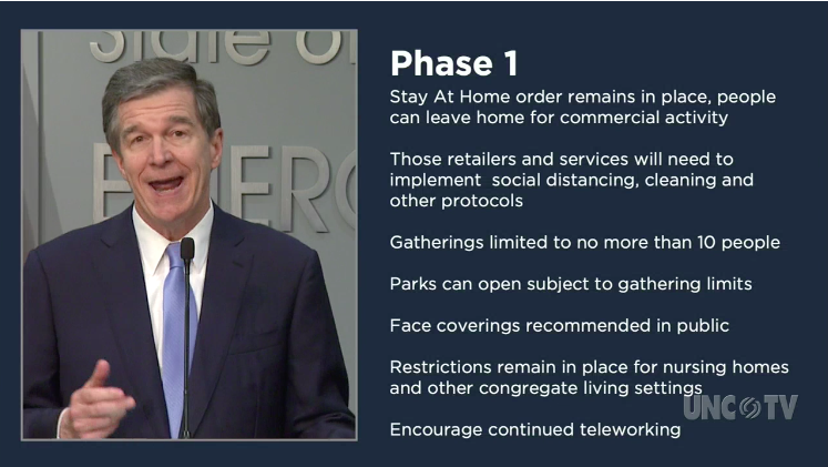 Above: Governor Roy Cooper discusses his decision to extend the ‘stay-at-home’ order and what a phased reopening of the state will look like.