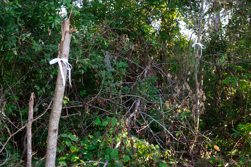 The car appears to have first landed approximately 120 feet from the damaged curb — marked by a rectangular impression in the marsh roughly the size of a sedan, on the same trajectory of Independence Road, the damaged curb, and the broken tree — before colliding with a large tree that was damaged at the bottom of its trunk, still surrounded by plastic car debris and floor mats. Again, some of the debris may have been from the initial crash and some from WPD efforts to secure the car and the as-of-yet unidentified bodies inside.