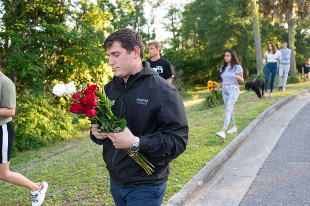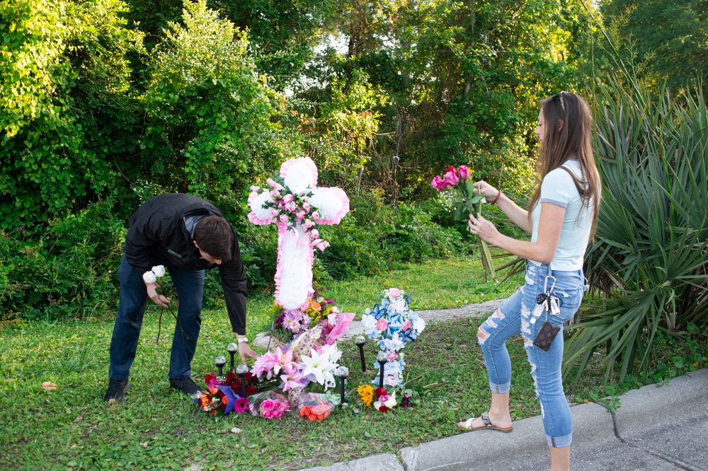 The group gathered at the memorial to lay flowers beneath a pink and white cross, cars speeding by on River Road. Grappler Pritchard, a car salesman who knew Mayorga for 15 years, spoke about their friendship before leading them in a prayer.