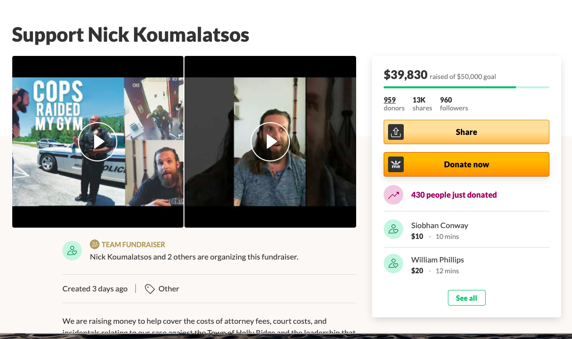 Koumalatsos started a GoFundMe page and, as of Memorial Day morning, has raised $47,187 of his $50,000 goal to help pay for legal expenses that he expects when he takes the town to court.
