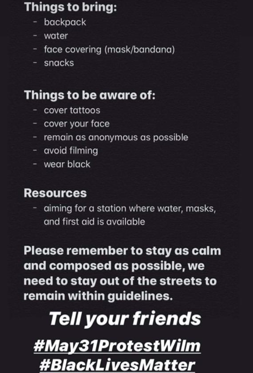 Now-deleted posts called for protestors to arrive and stay until after sundown, wearing all black, covering their faces and tattoos, and refraining from filming. Most other peaceful protests have been scheduled for during the day. Few other protests have encouraged anonymity and, given the sensitivity of police reaction to protests and the need for accountability, few organizers would encourage protestors not to be able to film protests.