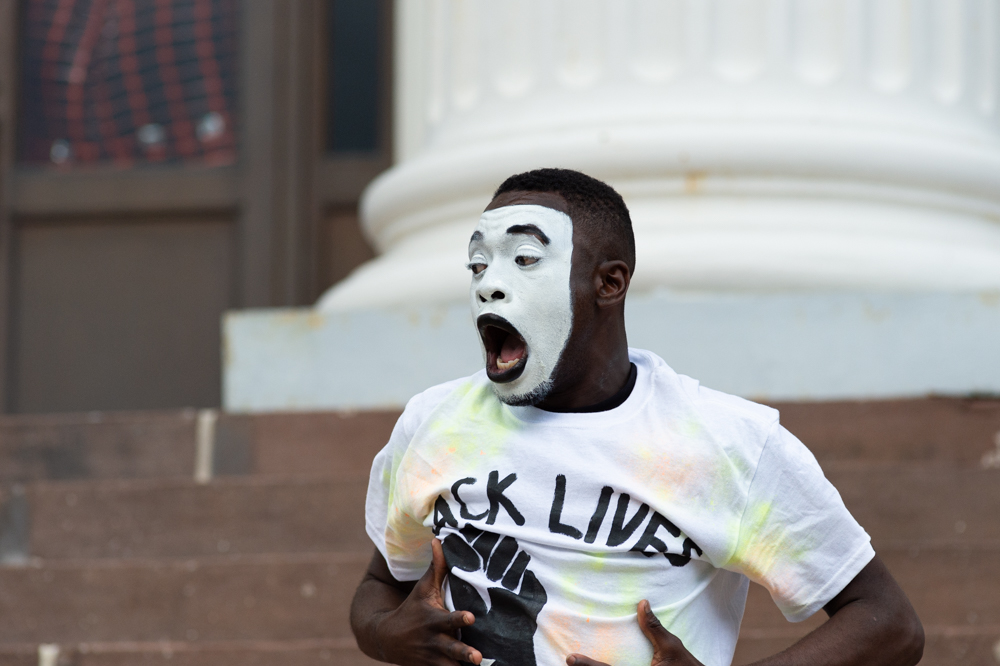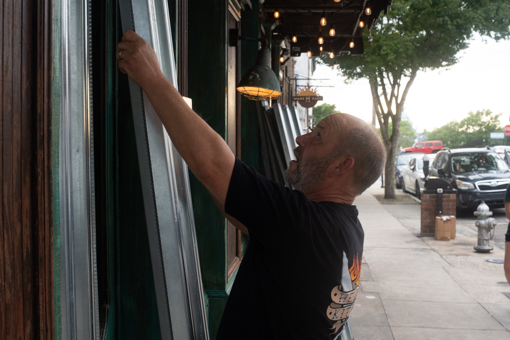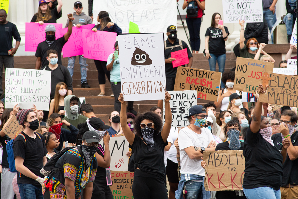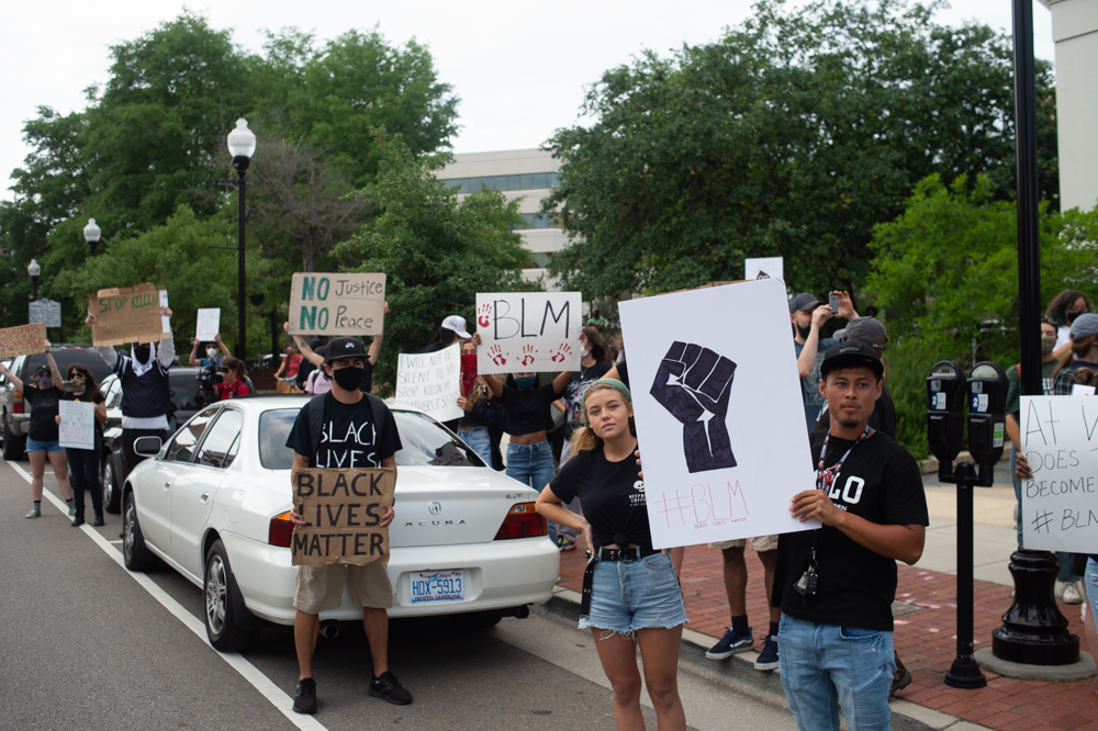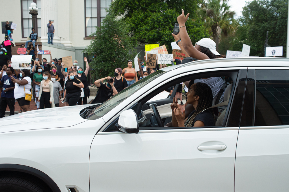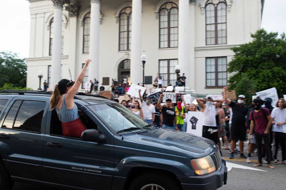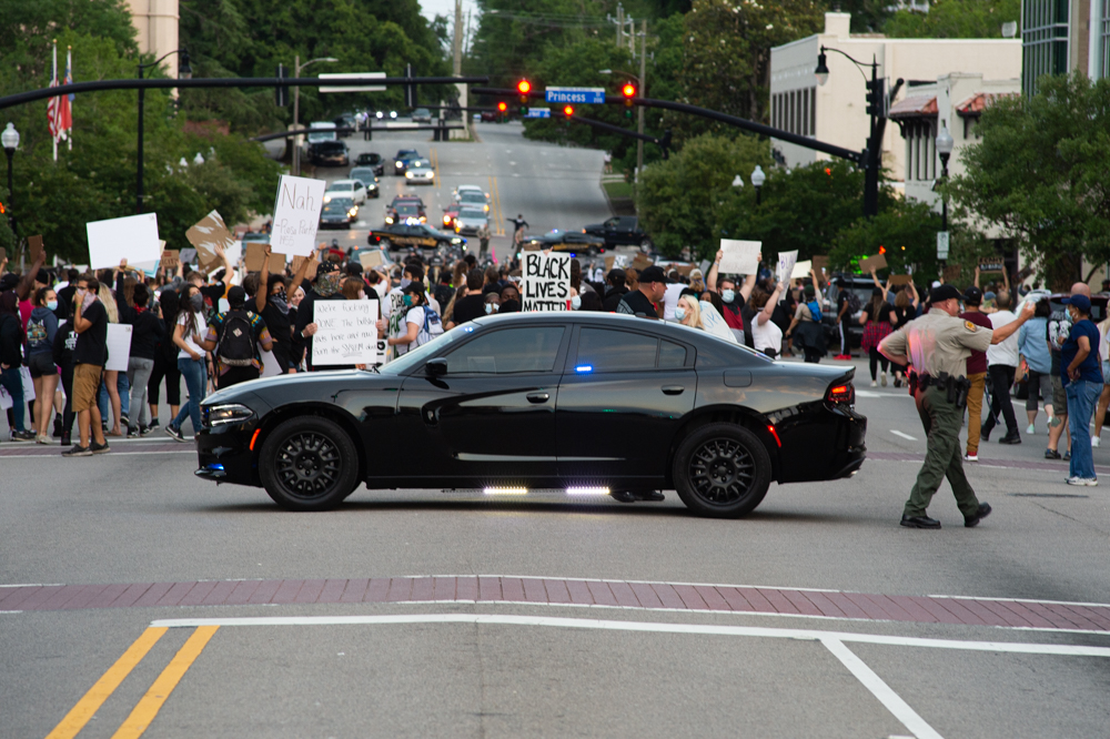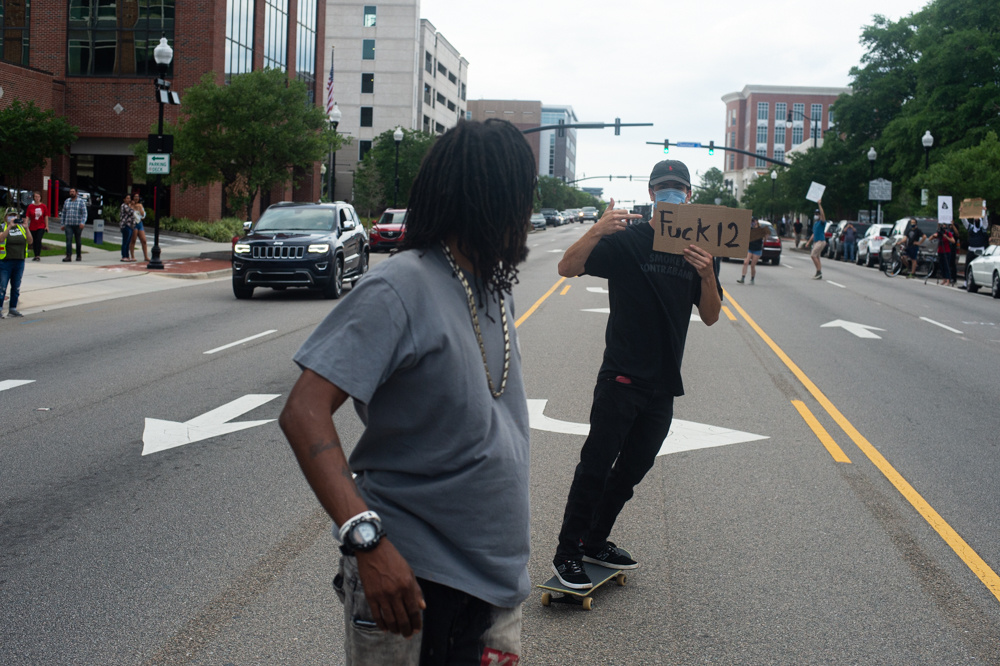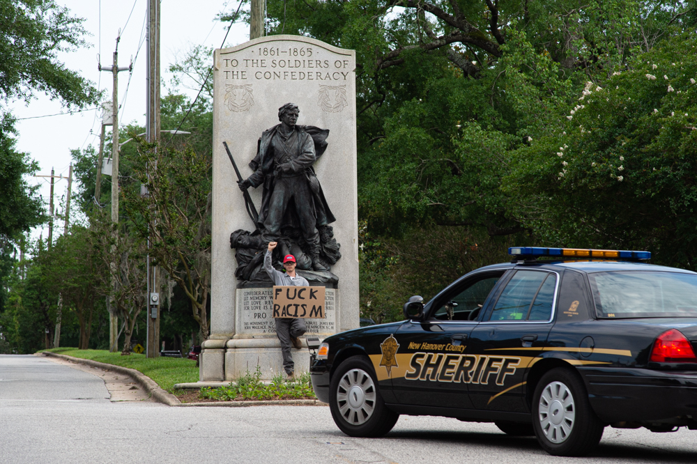 A protestor holds a sign at the Confederate Memorial on Third Street in downtown Wilmington as a county deputy vehicle turns onto Dock Street. (Port City Daily photo/Mark Darrough) The owner of Hell’s Kitchen, Eric Laut, puts up metal barriers on his front windows in case looting or property damage occurred later in the evening. (Port City Daily photo/Mark Darrough)A protestor performs an interpretative dance to gospel music outside City Hall early Sunday evening. (Port City Daily photo/Mark Darrough)A man and boy hold up signs in protest of the police killing of George Floyd. (Port City Daily photo/Mark Darrough)A protestor arrives at City Hall early Sunday evening. (Port City Daily photo/Mark Darrough)Protestors line Third Street outside City Hall early Sunday evening. (Port City Daily photo/Mark Darrough)A protestor skates by the crowd holding an anti-police slogan that has become popular in recent protests throughout the nation. (Port City Daily photo/Mark Darrough)Young women drive by in support of protestors outside City Hall early Sunday evening. (Port City Daily photo/Mark Darrough)A man protests the nationwide issue of police brutality on the front steps of City Hall early Sunday evening. (Port City Daily photo/Mark Darrough)People gather to protest the killing of George Floyd on the front steps of City Hall early Sunday evening. (Port City Daily photo/Mark Darrough)Protestors gather on Third Street after NCSO deputies had driven by multiple times to warn the crowd to stay off the street. (Port City Daily photo/Mark Darrough)A man who stopped beside the protesting crowd lifts his left arm to reveal a tattoo of the Confederate flag while protestors prevent others from getting into a physical confrontation. He then yelled, “White pride!” and drove away. (Port City Daily photo/Mark Darrough)A young woman sits on the window of a passing car and shows support of protestors outside City Hall early Sunday evening. (Port City Daily photo/Mark Darrough)At 7:50 p.m., the crowd of protestors march up Third Street past Thalian Hall. (Port City Daily photo/Mark Darrough)Protestors gather at the intersection of Third and Chestnut Street. (Port City Daily photo/Mark Darrough)