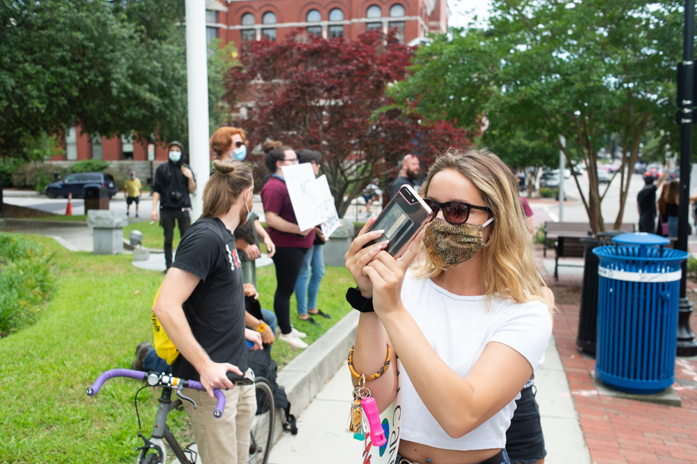 Murray said she joined with other protestors in cheering what they interpreted as a peaceful display. At that moment, Murray said, a law enforcement officer began firing rubber bullets (the gunshot can be heard on Murray’s video). Murray said she was uncertain if it was a police officer or a deputy, but that the person who fired was wearing all black (NHCSO deputies were wearing all black, WPD was wearing black and blue uniforms).