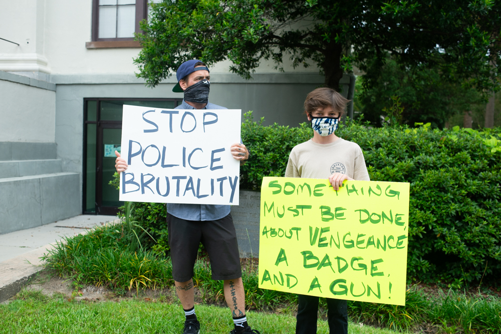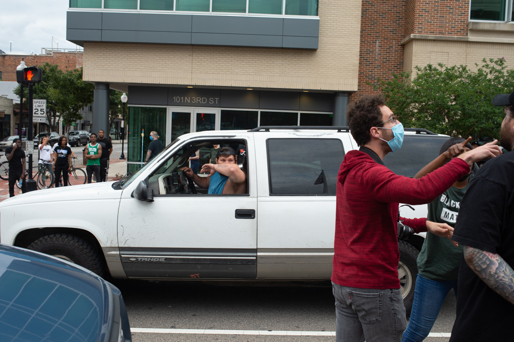 Before deputies responded with force, many cars had driven by the protestors honking in support. One man driving an old Chevy Tahoe, pulling a boat on a trailer, stopped in front of the crowd and instigated a verbal altercation with a few of the protestors. But two men held them back and prevented a physical confrontation before the man raised his left arm to reveal a tattoo of a Confederate flag, before yelling, “White pride!” and drove away.