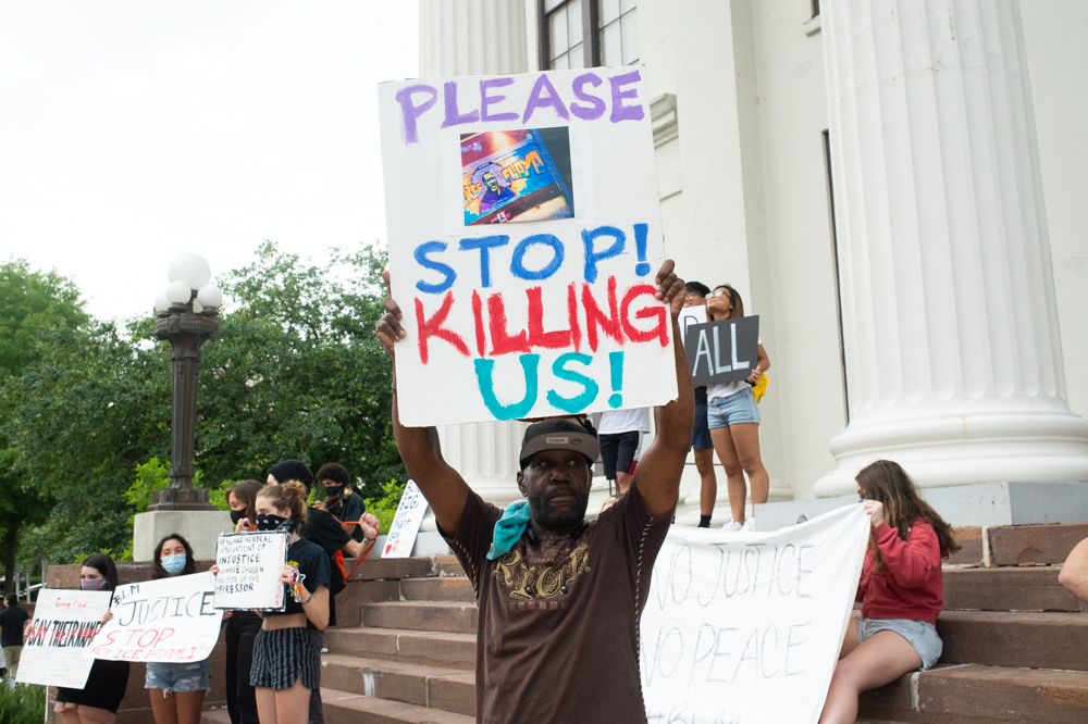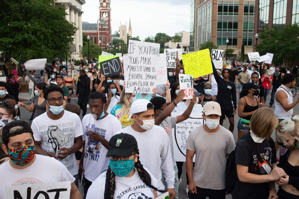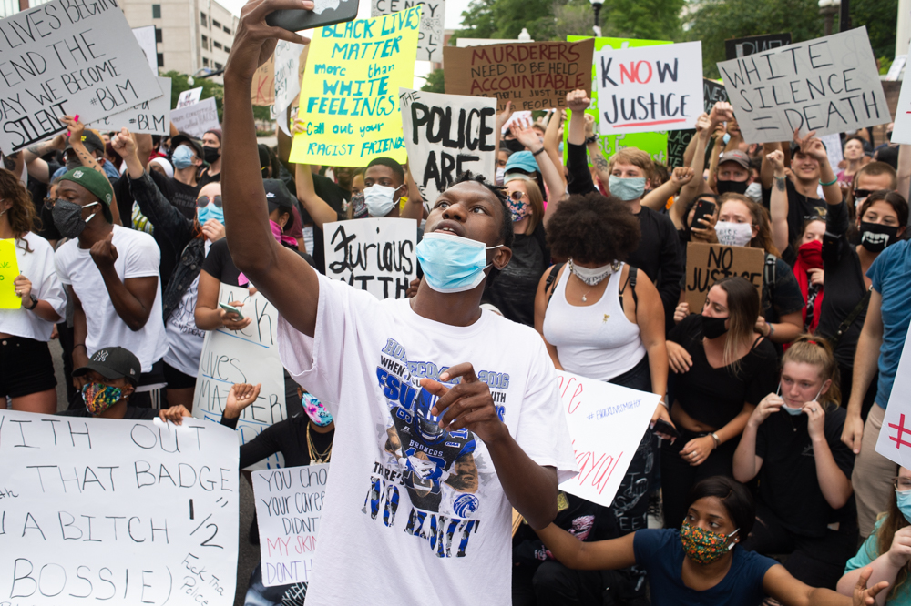 The group had first gathered outside City Hall to protest the death of a Minneapolis man, George Floyd, who was killed after being pinned down at the neck by a police officer for nearly nine minutes while pleading for a chance to breathe.