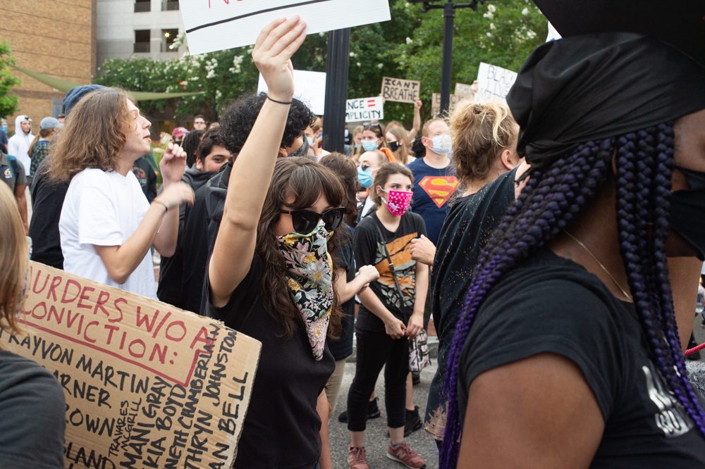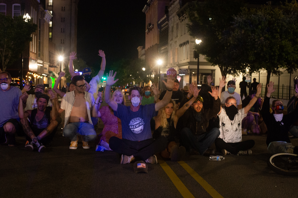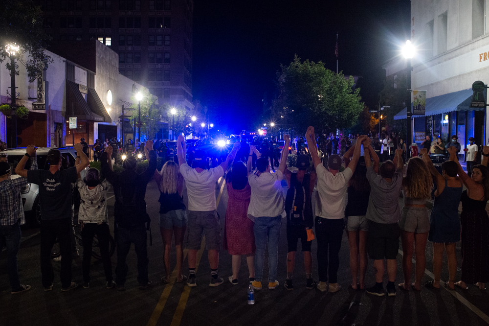 According to a video taken by Arlene Murray, who traveled to Wilmington to take part in the protest, after the initial clash between protestors and NHCSO deputies, the crowd moved to North Front Street. There, according to Murray, a line of WPD officers knelt in an apparent sign of de-escalation.