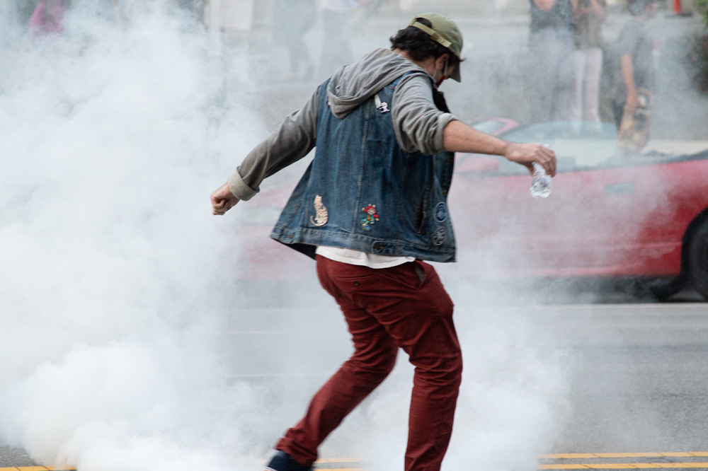 Although reporters observed protestors disobeying multiple orders to vacate the street, it appeared that it was only after tear gas canisters were fired at them that they began throwing water bottles at officers and deputies, as well as throwing gas canisters back at the officers and deputies who had fired them.