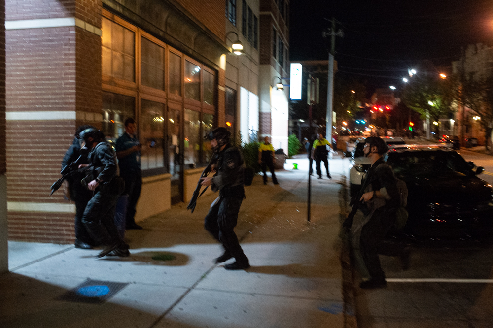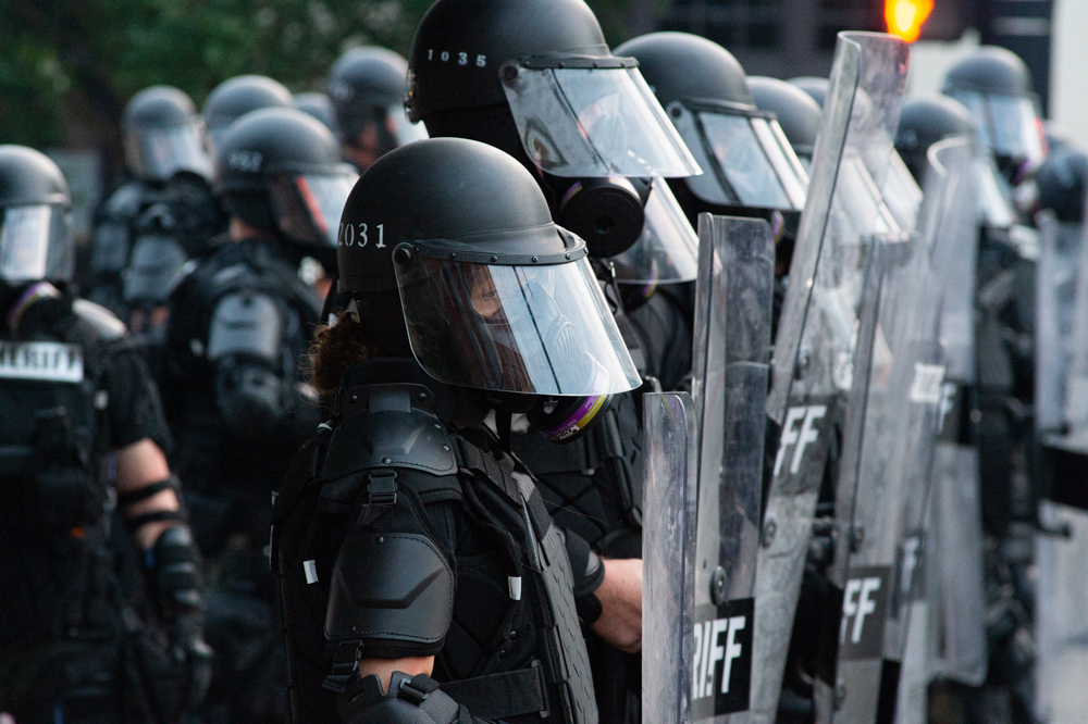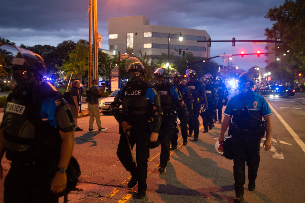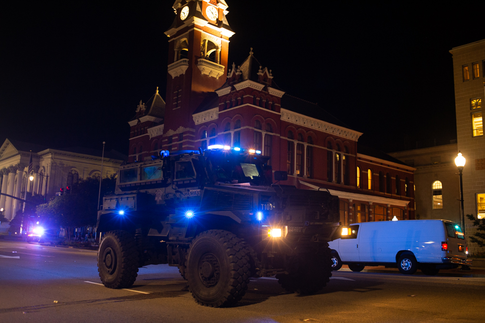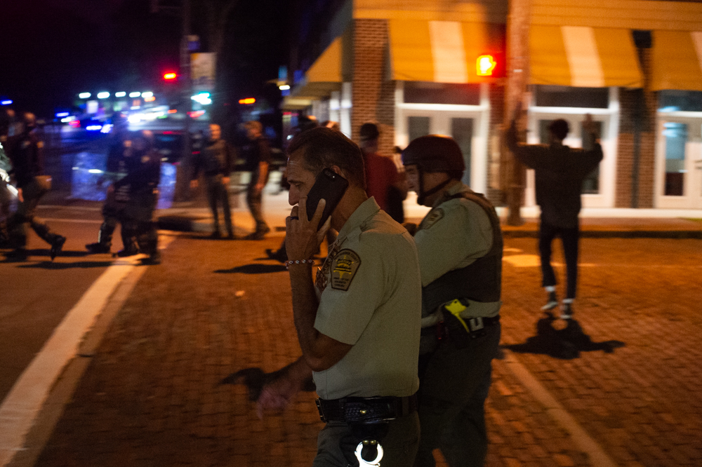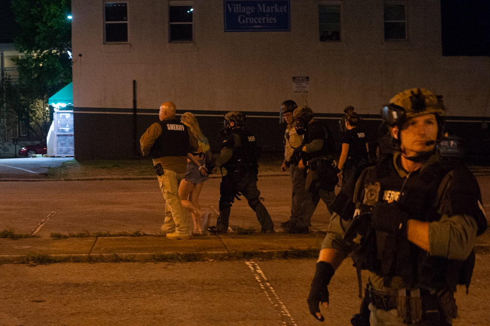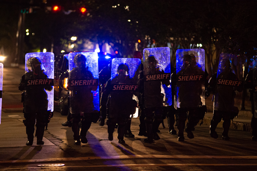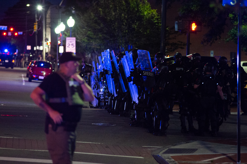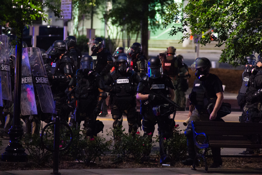 Lined formations of New Hanover County Sheriff’s Office deputies and Wilmington Police Department officers advanced down city streets with tear gas grenade launchers and protective shields throughout the night, beginning at 8 p.m. on Third Street next to Thalian Hall.