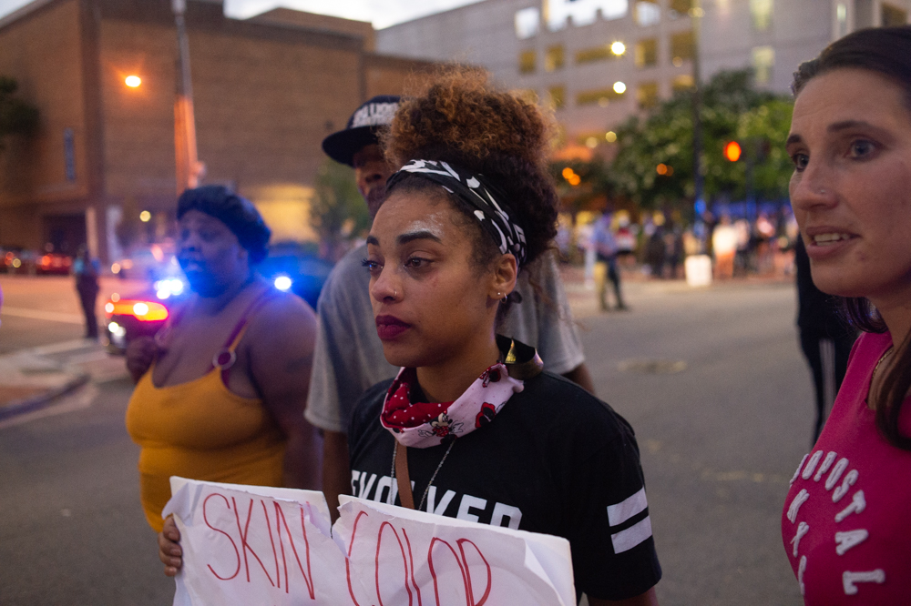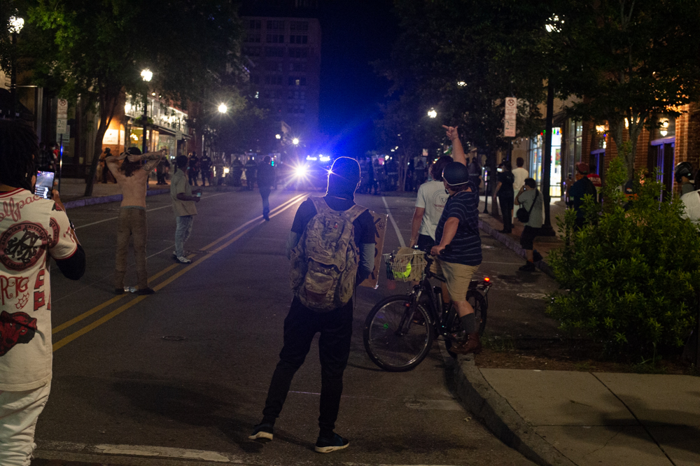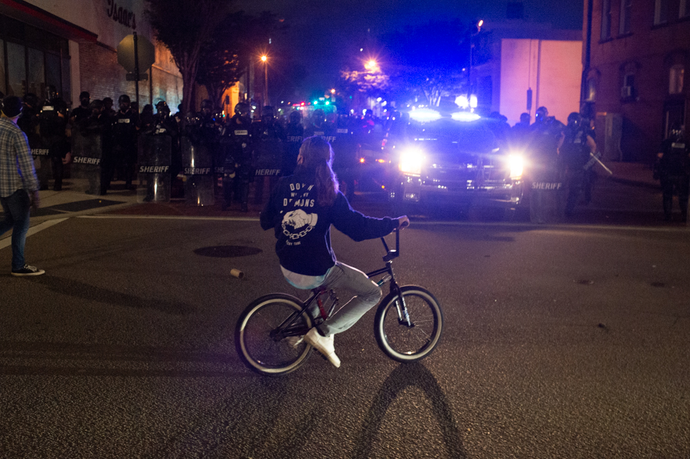 At 8 p.m., an NCSO deputy warns the protestors to leave the scene. (Port City Daily photo/Mark Darrough)A man turns his vehicle around at the intersection of Chestnut and Third Street after officers closed the area, pushing the protestors back to Market Street. (Port City Daily photo/Mark Darrough)A young man bikes away from a cloud of tear gas on Third Street on Sunday evening. (Port City Daily photo/Mark Darrough)A protestor kicks a tear gas canister on Third Street before dousing it with water. (Port City Daily photo/Mark Darrough)After most of the crowd dispersed, a protestor throws a tear gas canister back towards the line of Sheriff’s deputies wearing riot gear. (Port City Daily photo/Mark Darrough)Protestors refuse to disperse as clouds of tear gas spread at the intersection of Princess and Third Street. (Port City Daily photo/Mark Darrough)Protestors refuse to disperse as clouds of tear gas spread at the intersection of Princess and Third Street. (Port City Daily photo/Mark Darrough)A protestor holds up a sign as he and others refuse to disperse. (Port City Daily photo/Mark Darrough)Sheriff’s deputies wearing riot gear hold their line as they slowly advance up Third Street. (Port City Daily photo/Mark Darrough)A protestor after being exposed to a tear gas canister on Third Street. (Port City Daily photo/Mark Darrough)A protestor reacts in pain after she was exposed to a tear gas grenade on Third Street. (Port City Daily photo/Mark Darrough)The remaining protestors refuse to disperse after clouds of tear gas had cleared up near the intersection of Princess and Third Street. (Port City Daily photo/Mark Darrough)WPD officers wearing riot gear at the intersection of Third and Chestnut Street Sunday night. (Port City Daily photo/Mark Darrough)A protestor yells at WPD officers at the intersection of Third and Chestnut Street Sunday night. (Port City Daily photo/Mark Darrough)Lily Nicole, an assistant technical director at Thalian Hall and president of the start-up Wilmington School of the Arts, argues against law enforcement officers’ use of force, including tear gas grenades, with WPD’s interim chief Donny Williams. (Port City Daily photo/Mark Darrough)Lily Nicole refuses to leave the scene after she told WPD interim chief Donny Williams she had been tear gassed. (Port City Daily photo/Mark Darrough)