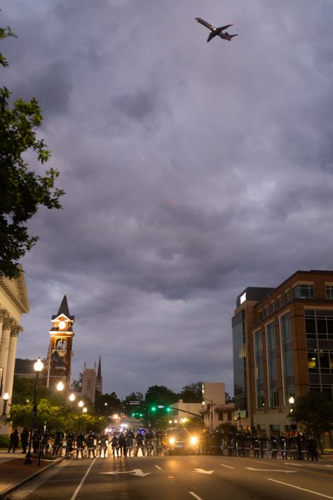 A plane flies over a line of NCSO deputies wearing riot gear on Third Street, 8:35 p.m. Sunday night. (Port City Daily photo/Mark Darrough)