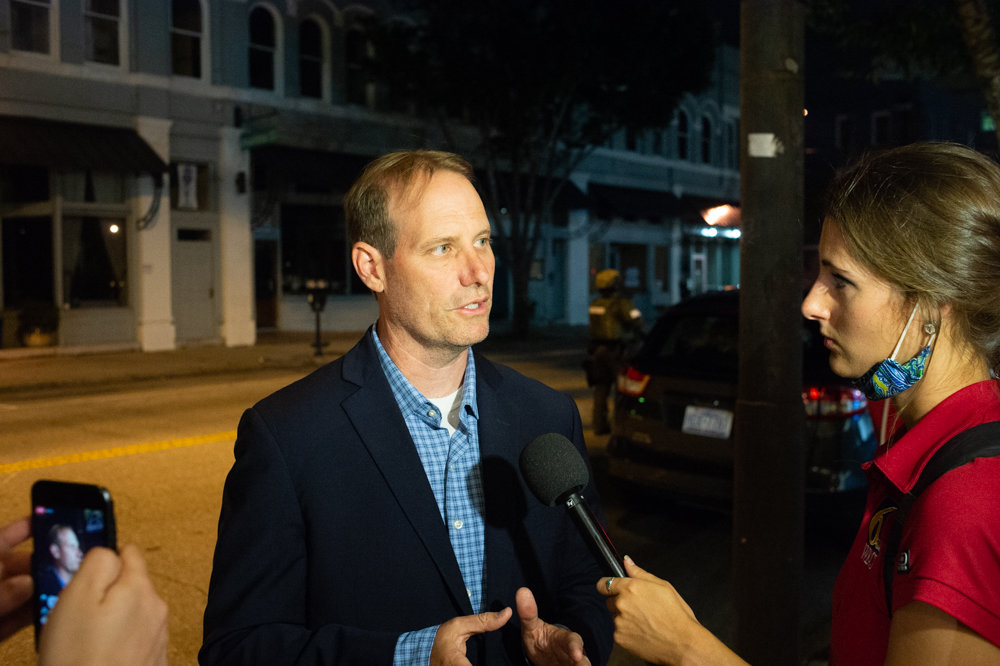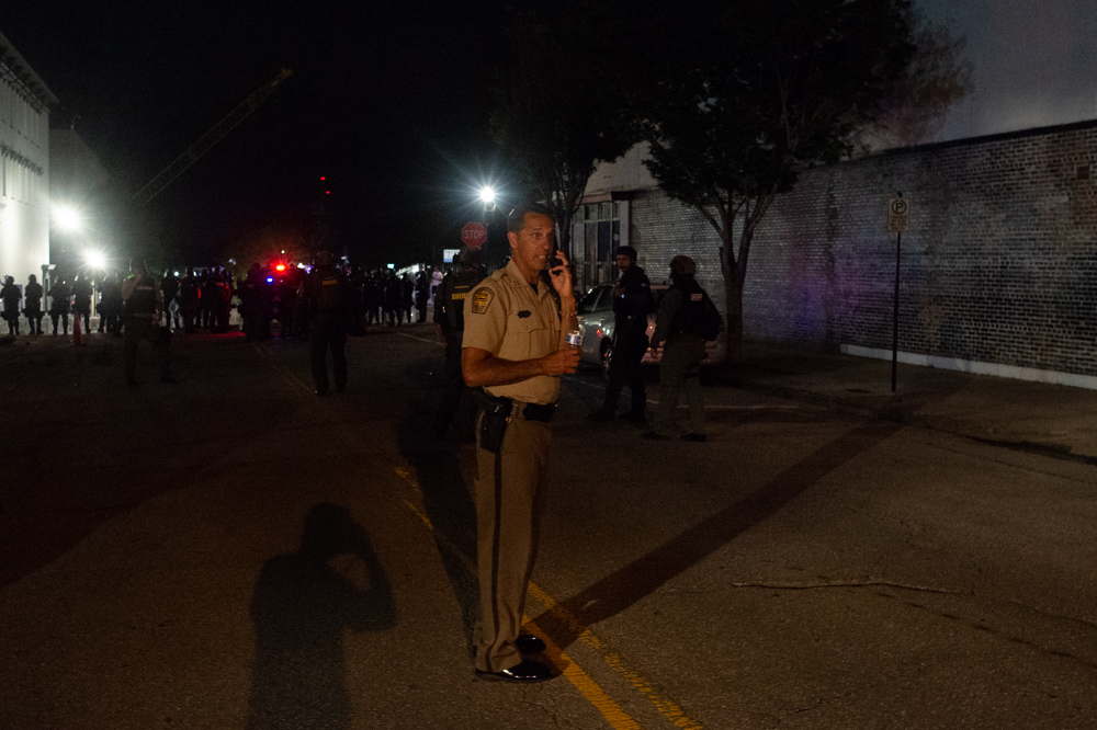 WPD officers clad in riot gear walk west down Chestnut Street. (Port City Daily photo/Mark Darrough)A tear gas canister hit near a deputy’s car before he moves his vehicle. (Port City Daily photo/Mark Darrough)A protestor runs toward a cloud of tear gas near City Hall, seen behind the line of deputies. (Port City Daily photo/Mark Darrough)NCSO deputies near City Hall after dispersing most protestors with tear gas grenades. (Port City Daily photo/Mark Darrough)Protestors refuse to disperse at the intersection of Third and Chestnut Street, 8:38 p.m. Sunday night. (Port City Daily photo/Mark Darrough)NCSO deputies near City Hall after dispersing most protestors with tear gas grenades. (Port City Daily photo/Mark Darrough)People watch from the top deck of the city parking garage as most protestors had been dispersed on Third Street; City Hall is seen to their left. (Port City Daily photo/Mark Darrough)A young couple embraces in the city parking garage overlooking Front Street Sunday night. (Port City Daily photo/Mark Darrough)Protestors sit on Front Street facing a line of WPD officers wearing riot gear and armed with tear gas grenade launchers. (Port City Daily photo/Mark Darrough)Protestors lock hands on Front Street facing a line of WPD officers wearing riot gear and armed with tear gas grenade launchers. (Port City Daily photo/Mark Darrough)A protestor yells at Sheriff’s deputies, “This is not progress!” while biking down Front Street, 9:29 p.m. Sunday night. (Port City Daily photo/Mark Darrough)New Hanover Sheriff Ed McMahon talks on the phone behind a line of deputies Sunday night. (Port City Daily photo/Mark Darrough)New Hanover District Attorney Ben David talks with reporters Sunday night after announcing a state of emergency and citywide curfew. (Port City Daily photo/Mark Darrough)A New Hanover SWAT team enters a parking garage after protestors were seen dropping items from above. (Port City Daily photo/Mark Darrough)Fireworks explode as New Hanover Sheriff’s deputies arrest a young female protestor after she yelled at them and refused to leave downtown Wilmington. (Port City Daily photo/Mark Darrough)New Hanover Sheriff’s deputies arrest a young female protestor after she yelled at them and refused to leave downtown Wilmington. (Port City Daily photo/Mark Darrough)New Hanover Sheriff Ed McMahon talks on the phone as he walks down Second Street, 9:49 p.m. Sunday night. (Port City Daily photo/Mark Darrough)A protester covers his face with a shirt on Front Street Sunday night. (Port City Daily photo/Mark Darrough)Protestors refuse to leave Front Street in central downtown Wilmington Sunday night. (Port City Daily photo/Mark Darrough)A journalist covers his eyes after he said he was hit by a tear gas canister while standing near the doorway of a local business on Front Street Sunday night. (Port City Daily photo/Mark Darrough)A man bikes away from a cloud of tear gas smoke in downtown Wilmington Sunday night. (Port City Daily photo/Mark Darrough)A line of New Hanover Sheriff’s deputies advance east on Market Street, late Sunday night. (Port City Daily photo/Mark Darrough)A New Hanover Sheriff’s emergency vehicle on 3rd Street as most protestors had vacated downtown following the announced 10 p.m. citywide curfew. (Port City Daily photo/Mark Darrough)