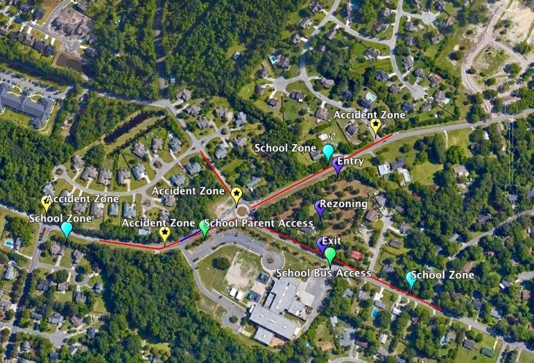 “The bottom Google Earth Photo/Map was developed by Middle Sound Lookout – one of the groups opposed to the rezoning. This map relies on data supplied by NC DOT on accidents at the intersections surrounding the development, the location of the school zones, the location of the development site, location of the school and access points for parent and bus transport and the queue lines of traffic for AM traffic passes well past the access points to the proposed development,” Parr said.