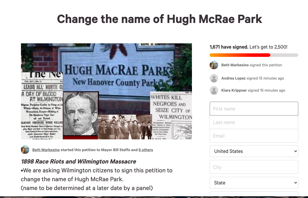 “We are asking Wilmington citizens to sign this petition to change the name of Hugh McRae Park (name to be determined at a later date by a panel). Hugh MacRae was a key player, along with Alfred Waddell, in instigating a very dark time and aspect of the state’s history,” the petition reads.