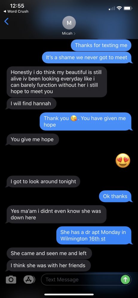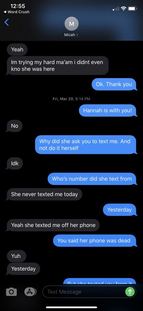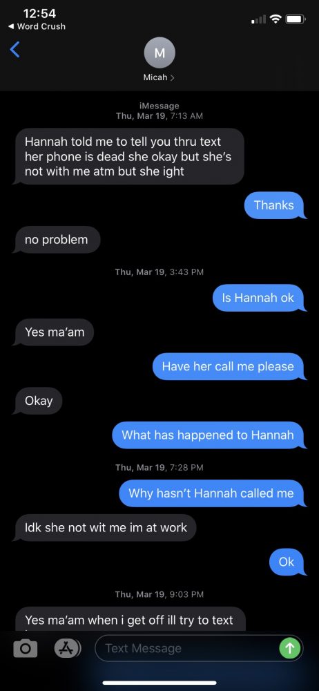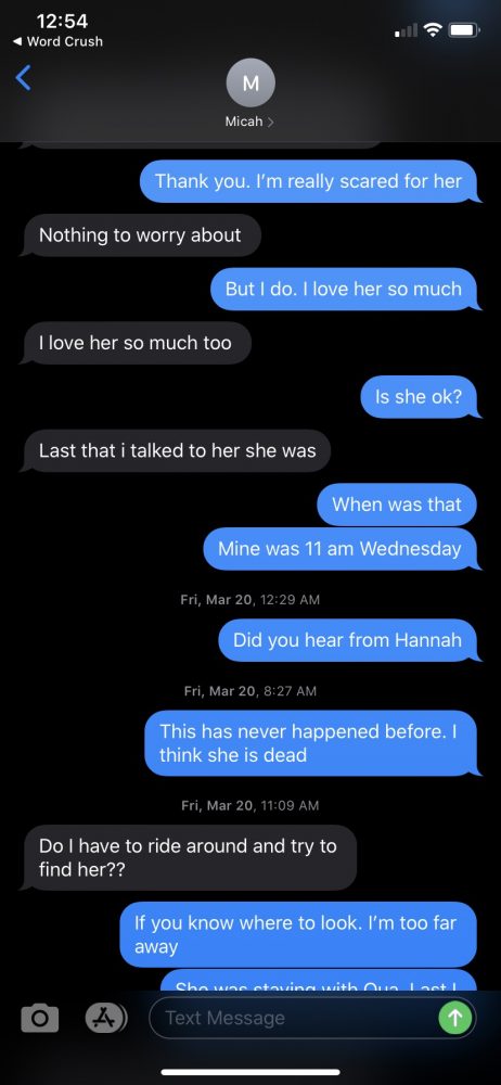 Monica Faith’s most concerning questions involve text messages between Hannah’s boyfriend and her own mother, Carolyn Faith, who had talked regularly with her daughter. Carolyn’s last phone communication with her granddaughter was on March 18. Days before, Hannah told Carolyn she was planning to break off her relationship with Micah Me’Nace Howard because they had been fighting, according to Monica.