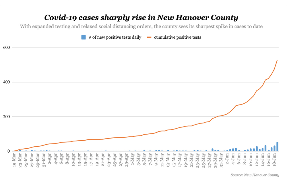 Locally, New Hanover County saw its largest one-day positive case count Friday. New cases have climbed by 51% in New Hanover County since last week, up 179 between June 12 and June 19. At 529 total cases, 136 have recovered, according to county data.