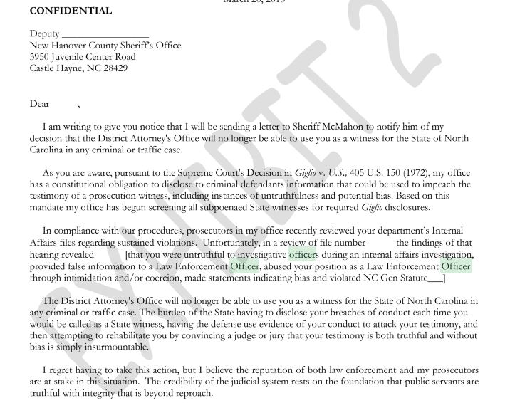 WILMINGTON — For the last seven years, the District Attorney’s office overseeing New Hanover and Pender counties has compiled a list of law enforcement officers whose personal or professional misconduct threatens to invalidate their potential testimony in court — but the list is confidential under state law.