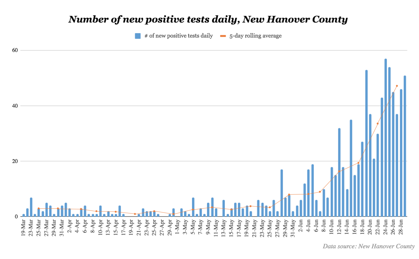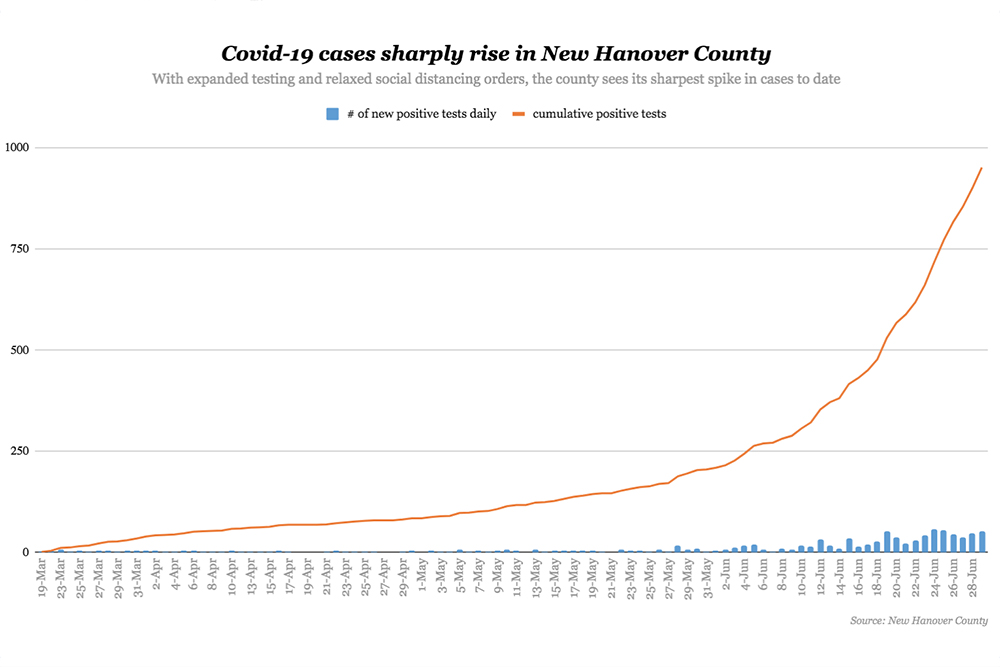 NEW HANOVER COUNTY — New Hanover County’s positive Covid-19 case count has nearly doubled in 11 days, on track to surpass 1,000 cases by Tuesday or Wednesday.