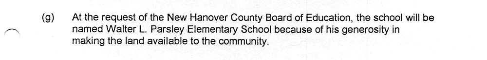 As a condition for purchasing the land, the New Hanover County Board of education requested the school be named Walter L. Parsley Elementary School “because of his generosity in making the land available to the community.” The reference included in the 1999 schedule of conditions may possibly be in reference to the seller, Parsley the grandson.