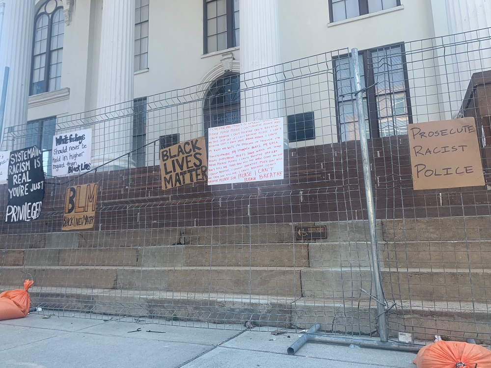 Protestors have also taken advantage of the safety measures to post signs across the length of fencing across the front of City Hall.