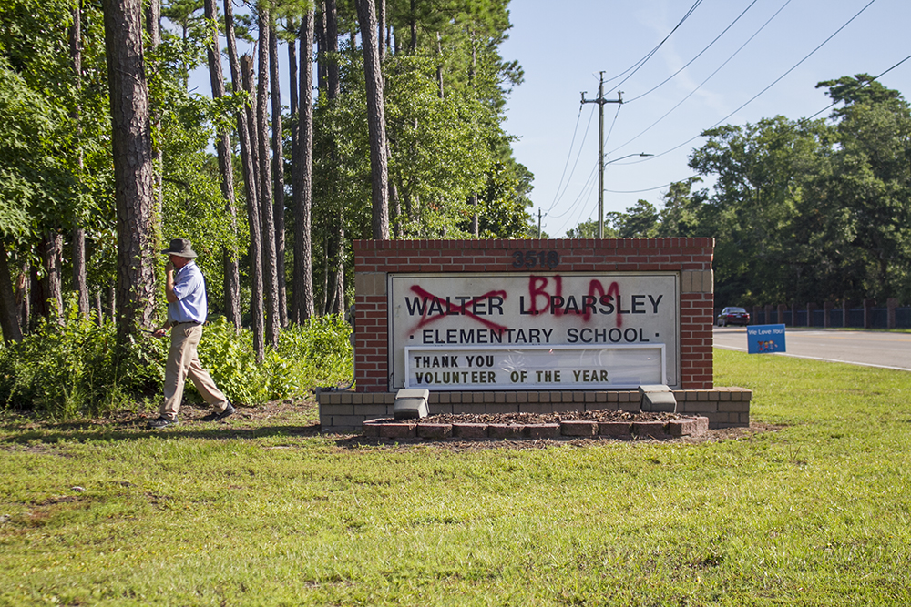 Parsley Elementary is one of many public and private spaces that have been vandalized since the May 25 killing of George Floyd while in the custody of the Minneapolis Police Department. Signs at Hugh MacRae (renamed Monday to Long Leaf Park), two Confederate statues in downtown Wilmington (removed overnight last month), downtown businesses, the walls at Eastport and Landfall, and more have been recently vandalized.