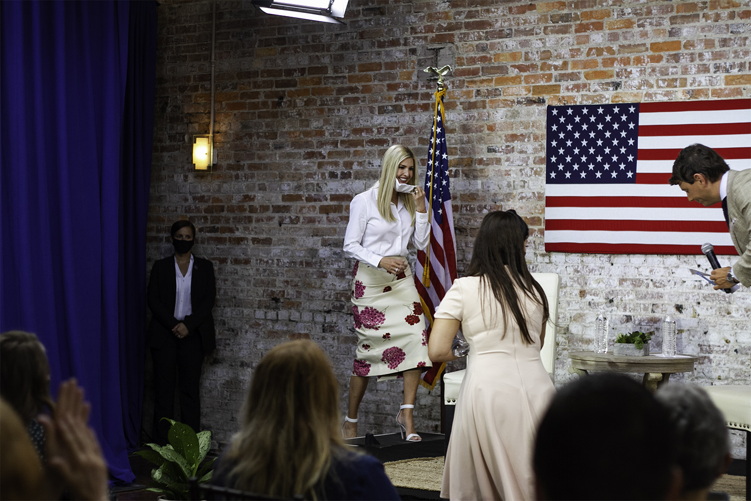 As The Beatles’ “Here Comes the Sun” played over the speakers, Ivanka Trump walked out from behind a blue curtain to applause from the small crowd. She took a seat on a small raised stage and prepared for her “fireside chat” — although the apparent reference to the radio addresses given by President Franklin D. Roosevelt was purely figurative, no actual fireplace was present. Meanwhile, Secret Service agents were stationed throughout the room, as were black-clad members of a private security firm who would not say whether they were based in Wilmington or elsewhere.