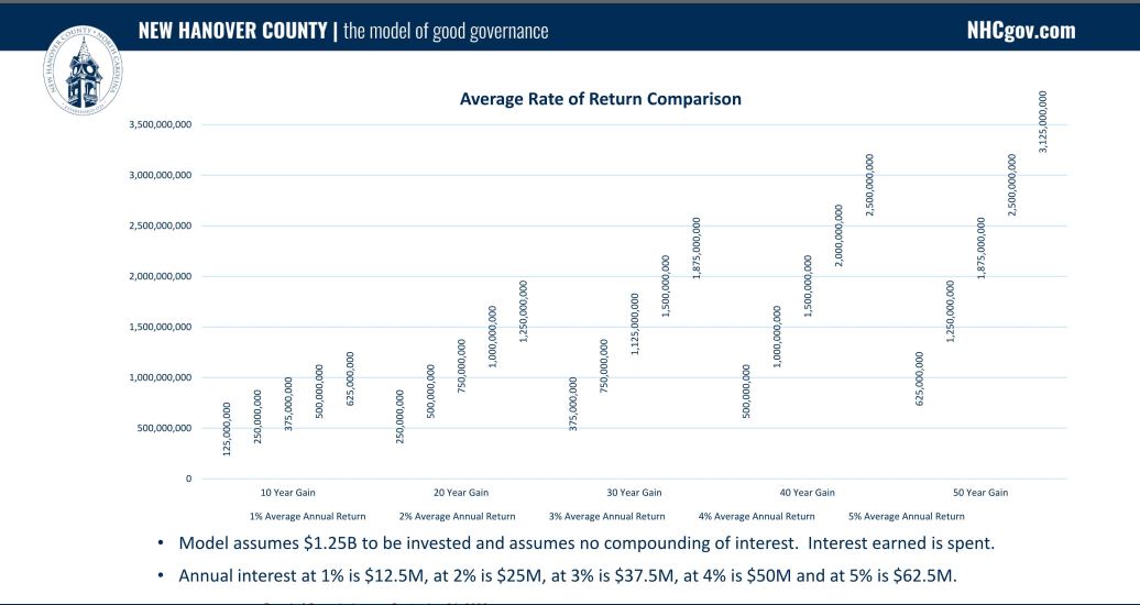 On Monday, County Finance Director Lisa Wurtzbacher gave commissioners a presentation showing a 50-year timeline for return on investment at various rates, from $12.5 million annually at 1% to $62.5 million at 5%. After 50 years, that added up to a difference of $2.5 billion between the highest and lowest interest rates.