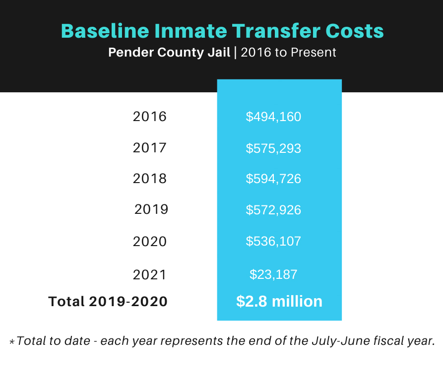 The county’s highest spending of known inmate transfer costs occurred in the 2017-2018 fiscal year, when it spent at least $594,726. According to former County Manager Randall Woodruff, the Pender County Sheriff’s Office transported 1,042 inmates to out-of-county jail facilities in 2018, using a total of 1,600 man-hours, 725 transports, and a total traveled distance of almost 78,000 miles across the state.