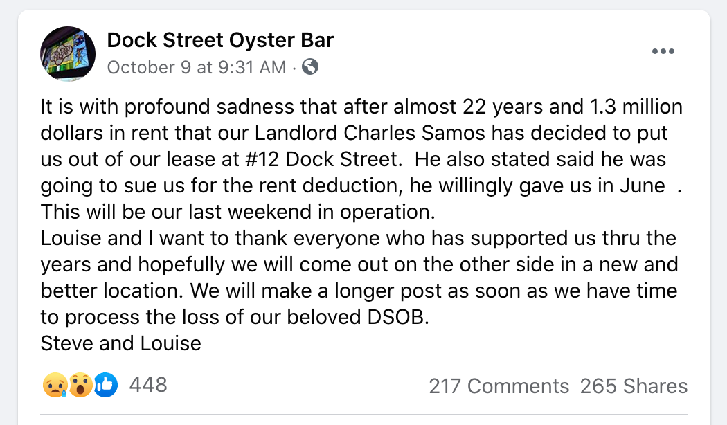 “It is with profound sadness that after almost 22 years and 1.3 million dollars in rent that our Landlord Charles Samos has decided to put us out of our lease at #12 Dock Street,” he wrote in the post. “He also stated he was going to sue us for the rent deduction he willingly gave us in June.”