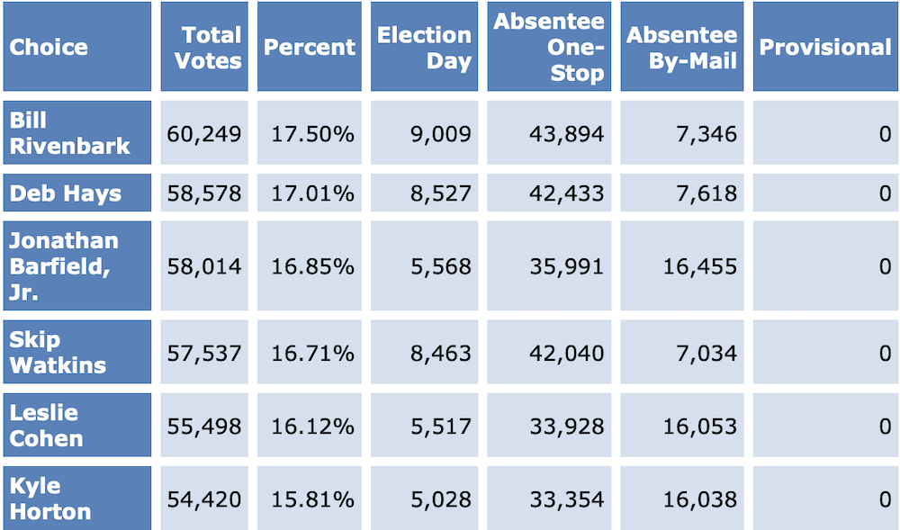 Rivenbark, currently a freshman member of the New Hanover County Board of Education, earned the highest number of ballots cast on Election Day (9,009). Cohen previously said she attributed his success in part to the ubiquity of the Rivenbark name in the local consciousness. Many members of the family have held prominent roles in the community for generations, most notably his brother, sitting five-term city councilman Charlie Rivenbark