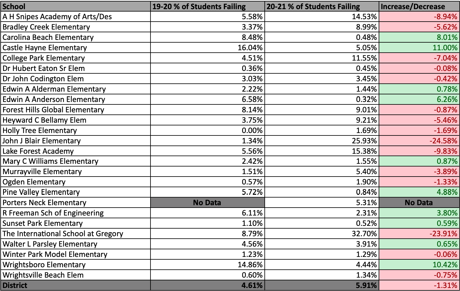 Some K-5 schools, such as Winter Park and Castle Hayne, have actually seen considerable improvements in their failure rates compared to this time last year, but other schools’ numbers are concerning.