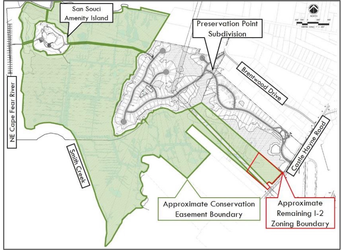 The Preservation Point project, represented by Coastal Land Design, is a subdivision along Castle Hayne Road that includes a 7-acre “private island.” Developers behind the project also own a 71-acre land tract directly south of the subdivision, currently located in an area zoned for industrial use. County land use staff note the subject site “contains both swamp forest and brackish marsh.” The rezoning request appears to be intended to increase the connectivity of the Preservation Point lots, without leading to the creation of new properties.
