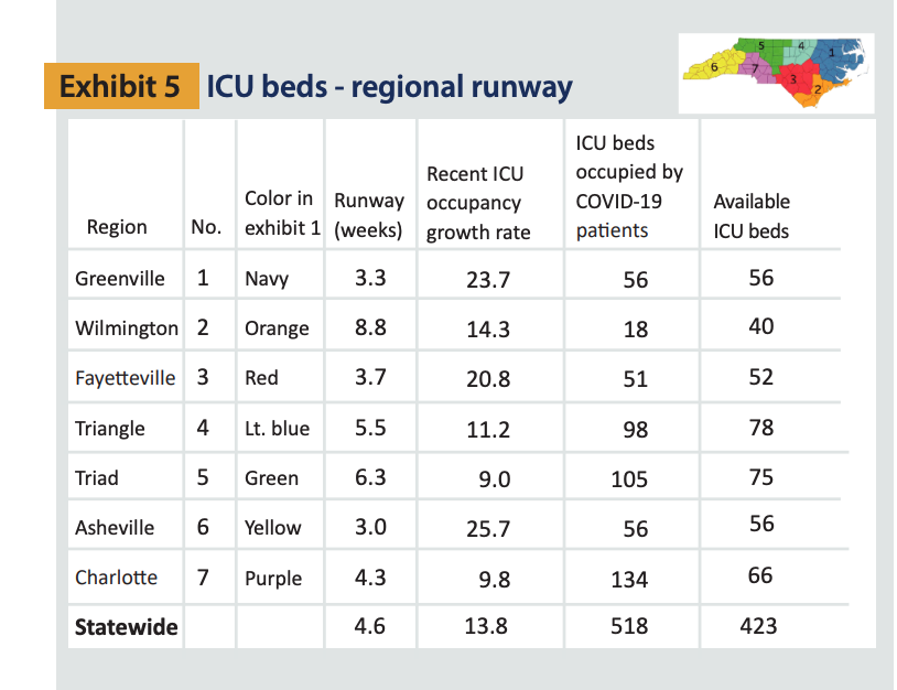 Data released from UNC’s Cecil Shep Center for Health Services Research gives an idea on how long hospitals in North Carolina cities can last before being overburdened. The research analyzed how many weeks it would take, in the current state of Covid cases rising, to reach or exceed acute or ICU capacity in Greenville, Wilmington, Fayetteville, the Triangle, the Triad, Asheville and Charlotte.