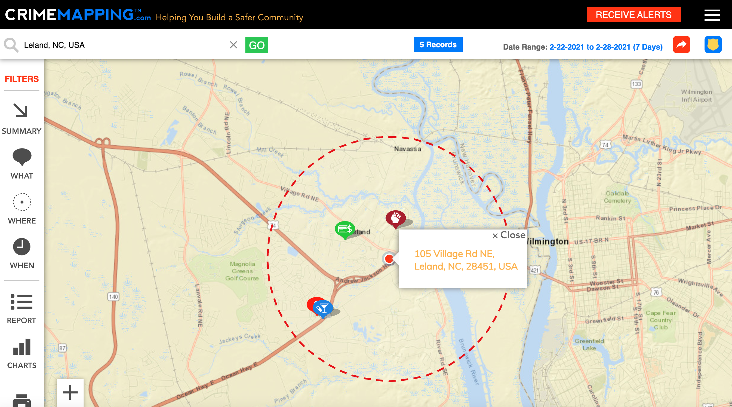 Leland users can type in an address, landmark, zip code or police department, and the data for the area pops up (they can check outside areas, too, as long as that local agency subscribes to CrimeMapping). Reports can be populated within 500 feet to a 2-mile radius of a location.