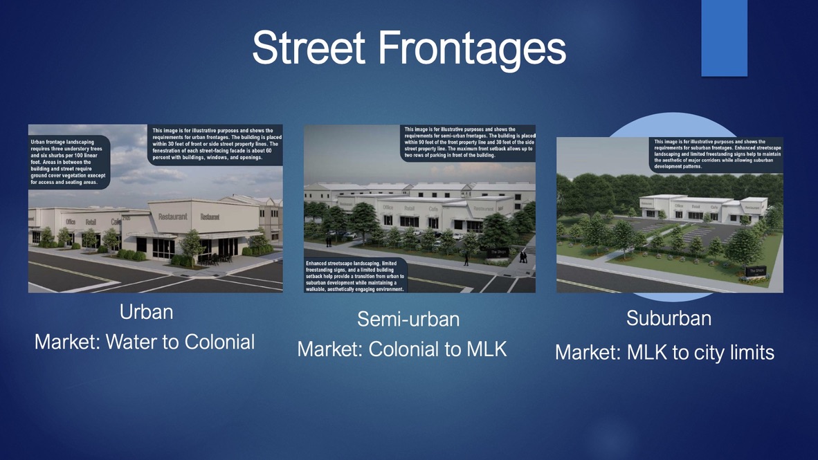 For example, in a suburban part of town (which on Market Street, for example, would extend from the Martin Luther King Jr. Boulevard intersection to the city limits), buildings could be pushed further back from the roads than in downtown.