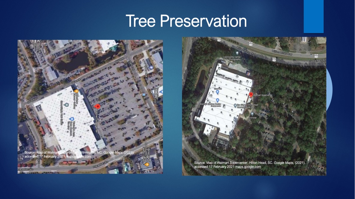 WILMINGTON – Monday morning, the City of Wilmington planning staff presented to council two similar yet drastically different aerial shots of Walmarts: one in Hilton Head, S.C., surrounded by a lush green canopy, and the other on Sigmon Road in Wilmington, surrounded by gray asphalt.