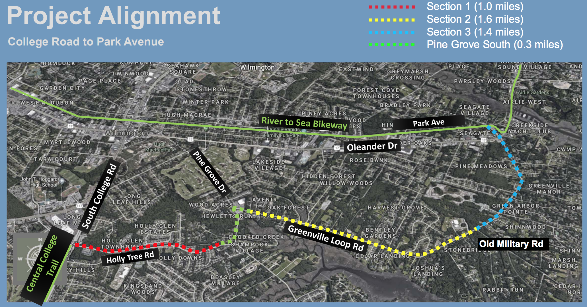 In all, the trail will include three pedestrian crossings: one on Greenville Loop Road, one across South College, and one across Oleander. City officials and consultants are considering placing the Greenville Loop crossing near the deep bend in the road or around Bradley Creek Elementary School. Providing a safe crossing on the west side of Greenville Loop Road across Oleander Drive is a primary concern for staff, according to this week’s presentation.