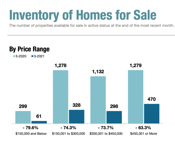 Last month, there were just 328 homes for sale under $300,000 in the tri-county region (population: 440,000 people), down 74% compared to last year. “When you have that much of a shortage, it definitely skews things,” Gale said.